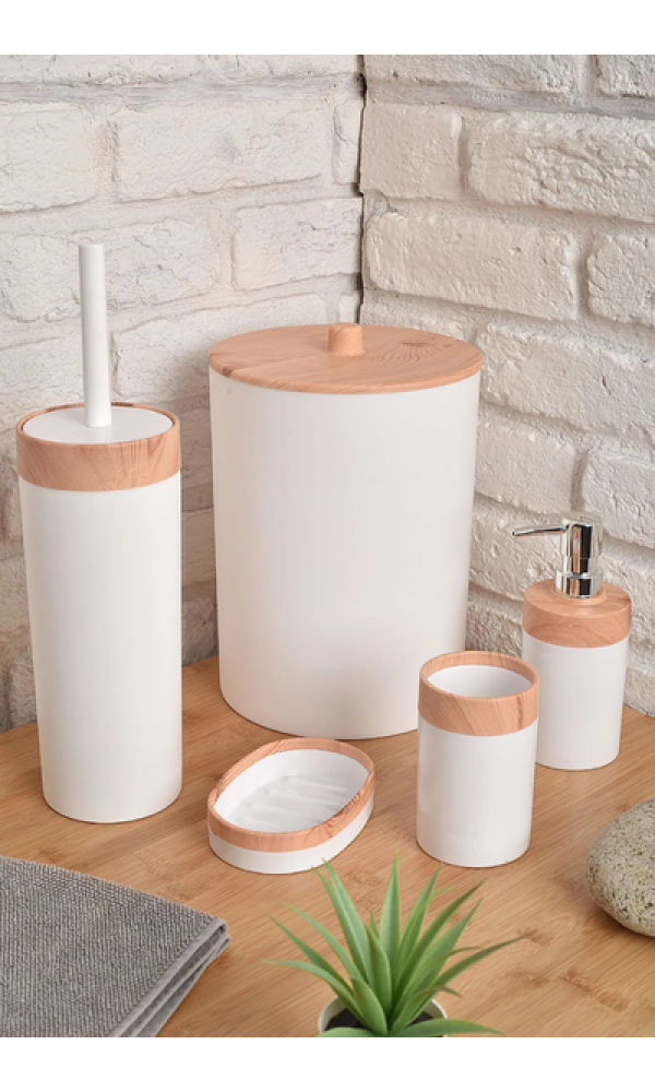 BersaChef Limpia Bambu Desenli 5'li Banyo Seti Çöp kovası Sıvı Sabunluk diş fırçalık kutusu Banyo Seti Beyaz