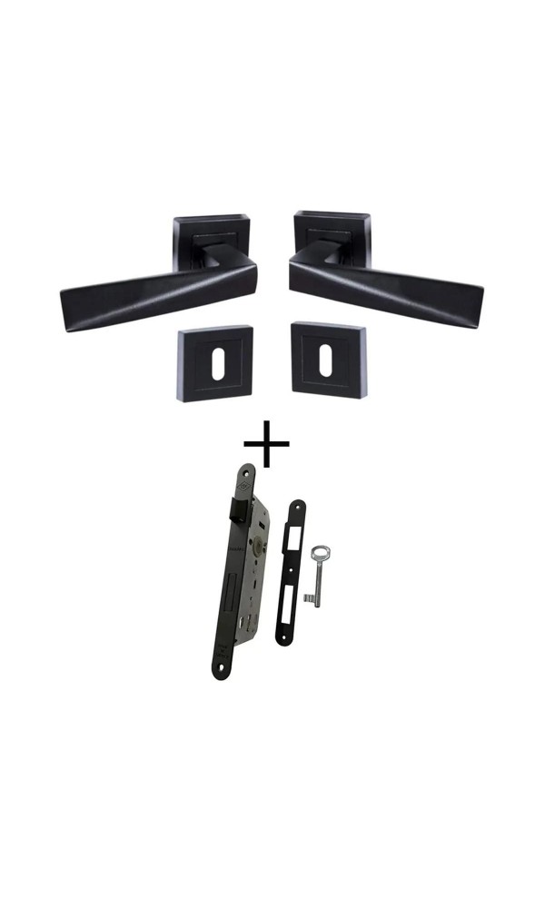 Bersa Yapı Prizma Rozetli Oda Kapı Kolu ve Sesiz Gömme Kilit Mat siyah 1 Kapılık Takım Siyah Kapı Kilidi 40mm