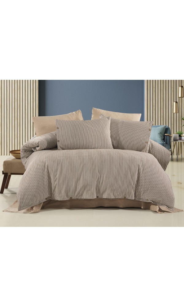 Çift Kişilik Çarşaflı Nevresim Takımı Pamuklu 6 Parça Kahverengi Çizgili | OAB Home