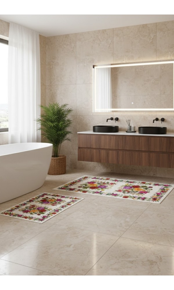 Oabhome Safir 2'li Çiçek Desenli Banyo Paspası Seti