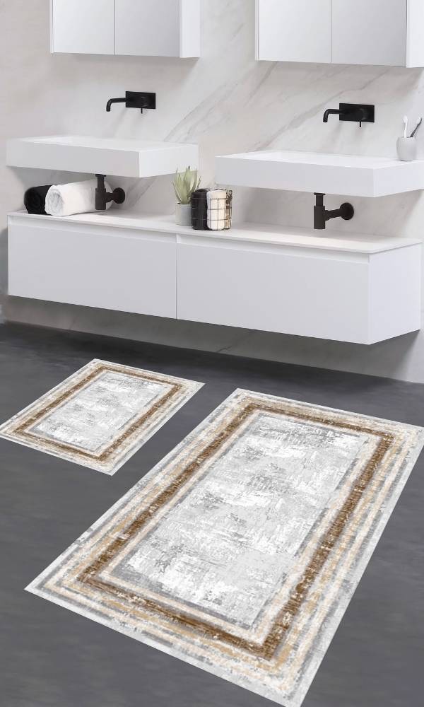 Oabhome Safir 2'li Banyo Paspası Seti – Yıkanabilir, Kaymaz Taban, Renkli Dekoratif, Dijital Baskı, Kahve-Grimsi