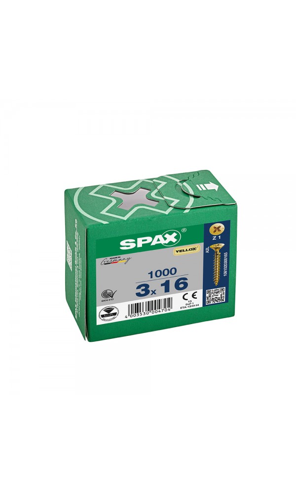 Spax Sunta Vidası, Evrensel Vida, 3 x 16 mm, 1.000 Adet, Tam Dişli, Havşa Başlı, Yıldız Z1, SPAX-S Versiyon, YELLOX Kaplama