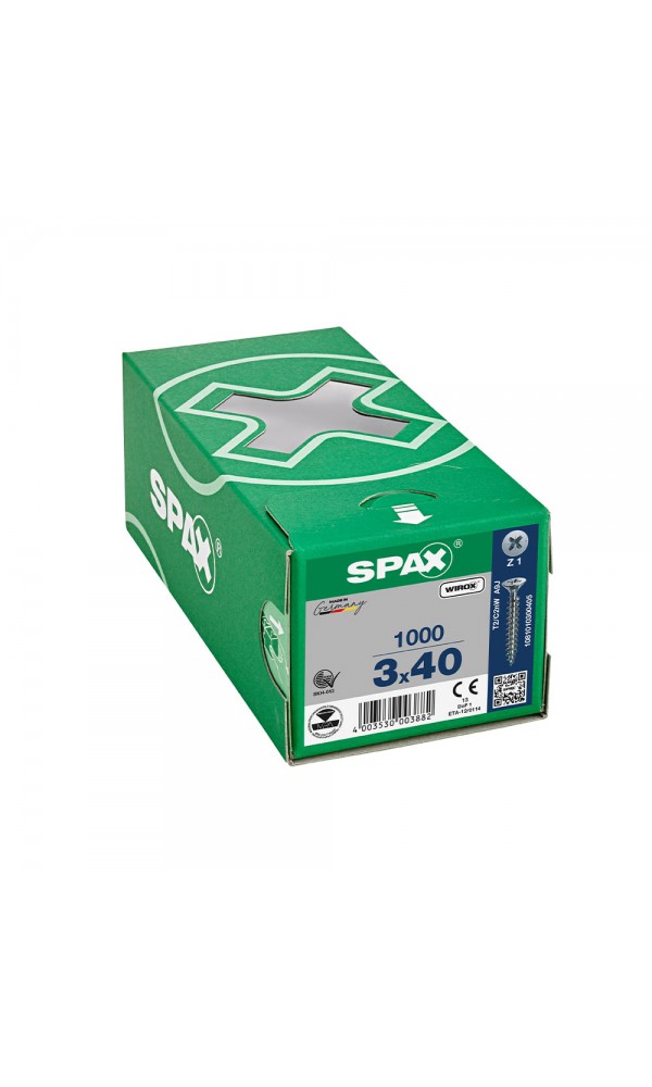 Spax Sunta Vidası, Evrensel Vida, 3 x 40 mm, 1.000 Adet, Tam Dişli, Havşa Başlı, Yıldız Z1, SPAX-S Versiyon, WIROX Kaplama