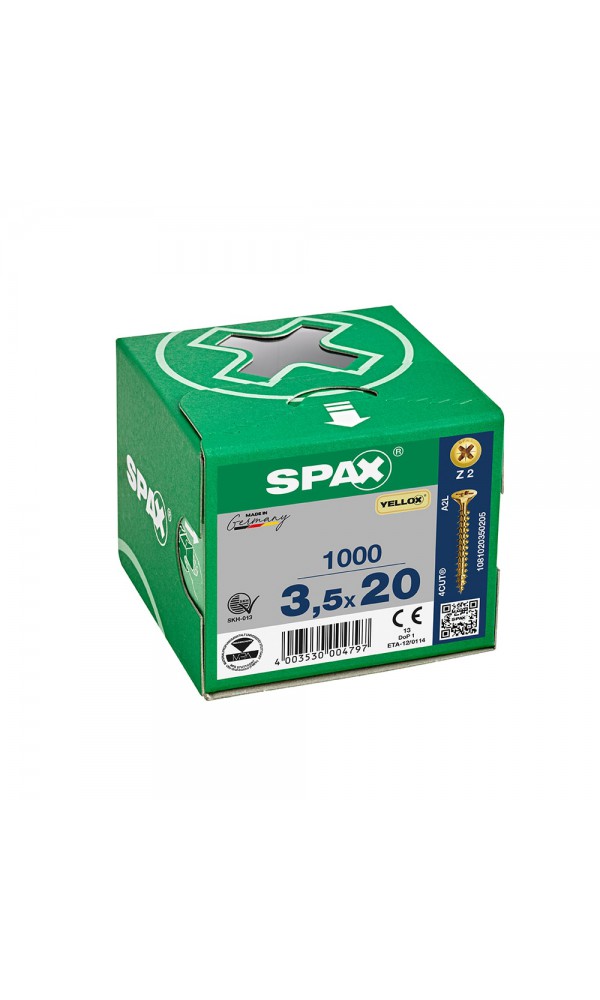 Spax Sunta Vidası, Evrensel Vida, 3,5 x 20 mm, 1.000 Adet, Tam Dişli, Havşa Başlı, Yıldız Z2, 4KESİCİ UÇlu, YELLOX Kaplama