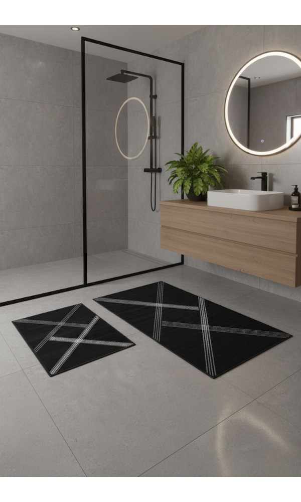Oabhome Safir 2'li Banyo Paspası Seti – Yıkanabilir, Kaymaz Taban, Renkli Dekoratif, Dijital Baskı, Siyah