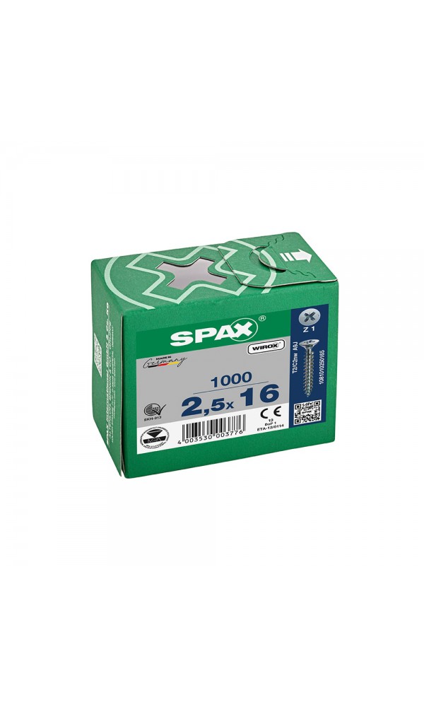 Spax Sunta Vidası, Evrensel Vida, 2,5 x 16 mm, 1.000 Adet, Tam Dişli, Havşa Başlı, Yıldız Z1, SPAX-S Versiyon, WIROX Kaplama