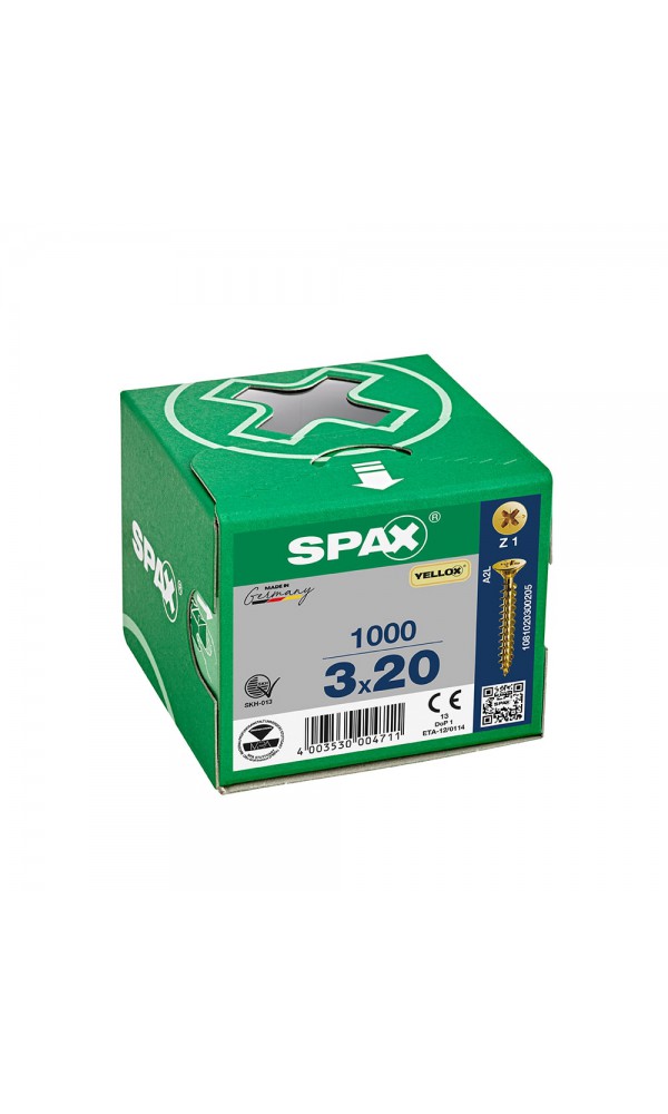 Spax Sunta Vidası, Evrensel Vida, 3 x 20 mm, 1.000 Adet, Tam Dişli, Havşa Başlı, Yıldız Z1, SPAX-S Versiyon, YELLOX Kaplama