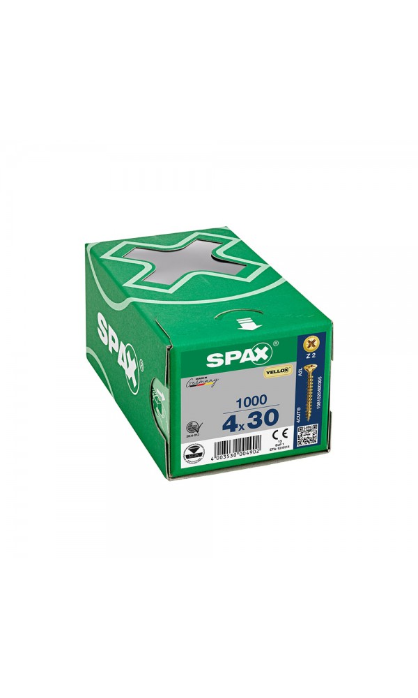 Spax Sunta Vidası, Evrensel Vida, 4 x 30 mm, 1.000 Adet, Tam Dişli, Havşa Başlı, Yıldız Z2, 4KESİCİ UÇlu, YELLOX Kaplama