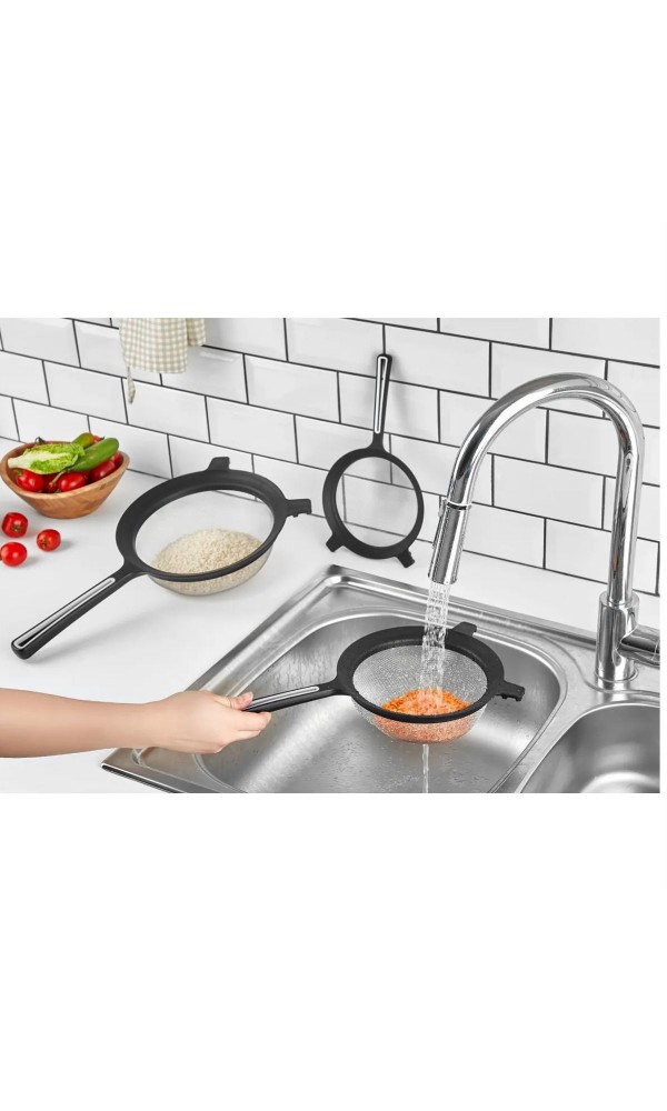 - Üç farklı boyutta (22cm, 18cm, 14cm) paslanmaz çelik süzgeç seti ile çeşitli pişirme ihtiyaçlarınıza uygun çözümler sunar.