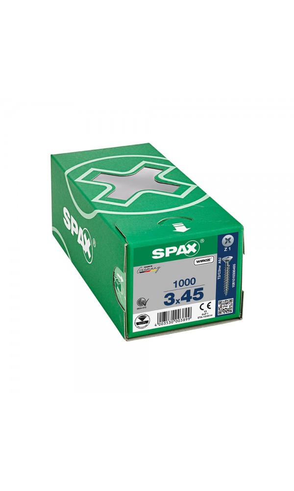 Spax Sunta Vidası, Evrensel Vida, 3 x 45 mm, 1.000 Adet, Tam Dişli, Havşa Başlı, Yıldız Z1, SPAX-S Versiyon, WIROX Kaplama
